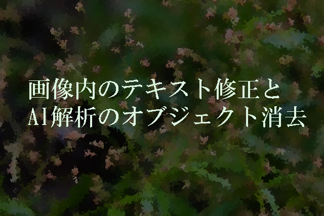 画像加工ソフトウェアの中には、AI解析によって特定のオブジェクトを消去し、背景画像をある程度復元できるような仕組みもあります。この機能により、画像内のテキスト文字だけを消すということが可能である場合があります。